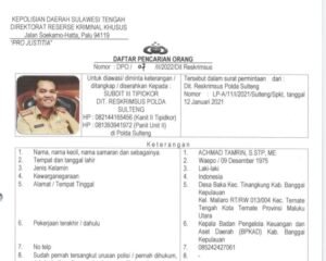 Jawaban itu disampaikan Polda melalui lembaran selembar surat Pro Justitia Daftar Pencarian Orang (DPO) <span;>bernomor : DPO/07/II/2022/Dit Reskrimsus yang ditandatangani langsung Direktur Reskrimsus Polda Sulteng, Kombes Ilham Saparona, selaku Penyidik.