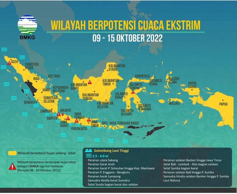 Luwukpost.id — Badan Meterologi, Klimatologi dan Geofisika atau BMKG memberikan peringatan dini tentang adanya potensi cuaca ekstrim seperti hujan dengan intensitas tinggi atau lebat yang diprediksi dimulai pada periode 9 sampai dengan 15 Oktober 2022.