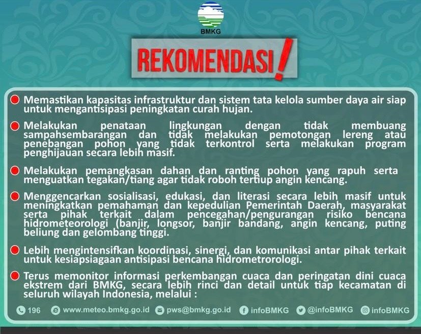 Berdasarkan analisis atas fenomena global, regional dan lokal tersebut, maka BMKG khususnya untuk sepekan kedepan memprediksi potensi curah hujan dengan intensitas sedang hingga lebat dapat disertai kilat petir dan angin kencang.