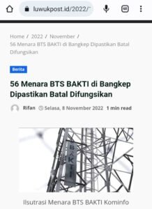 • Informasi tentang pembatalan 56 Menara BTS BAKTI Kominfo di Banggai Kepulauan (Bangkep) yang ada di dalam berita itu adalah keliru. kekeliruan itu sepenuhnya disebabkan kekeliruan pihak menejemen redaksi Luwukpost.id Biro Kabupaten Banggai Kepulauan