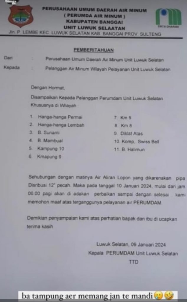 Dalam surat pemberitahuan tertanggal 9 Januari 2024, yang ditandatangani Kepala PERUMDA Air Minum Unit Luwuk Selatan, disebutkan perbaikan akan dimulai pukul 6 pagi sampai dengan selesai.