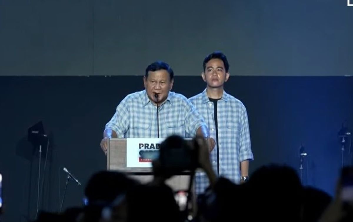(PRABOWO-Gibran deklarasi kemenangan di Istora, minta pendukung jangan jumawa.-YouTube Narasi Newsroom)