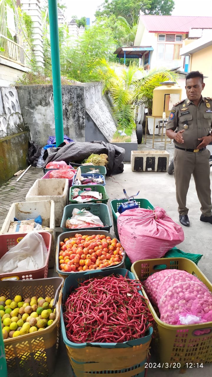 “Adapun barang bukti PKL yang disita berupa cabai, bawang merah, tomat, terpal, kayu, keruk nipis, keranjang, daun bawang dan lain sebagai.”