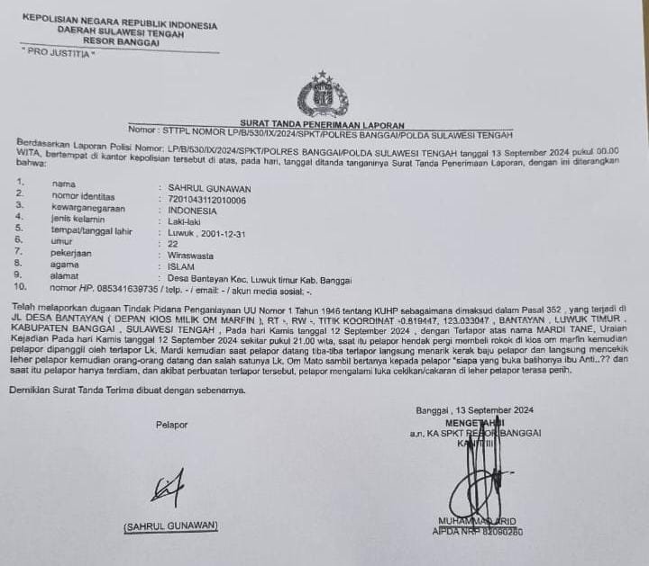 Informasi diterima media ini laporan korban langsung diterima petugas SPKT Polres Banggai dengan Nomor STTPL LP/B/530/IX/2024.
