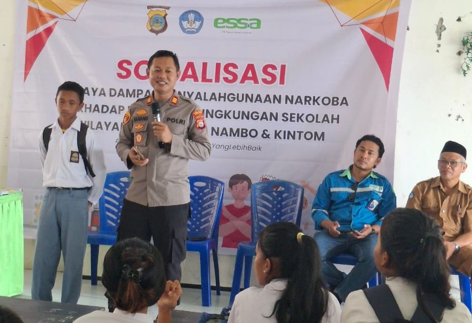 Kapolsek Kintom AKP Nanang Afrioko bersama PT Panca Amara Utama (PAU) menggelar sosialisasi bahaya penyalahgunaan narkoba bagi pelajar di lingkungan sekolah.