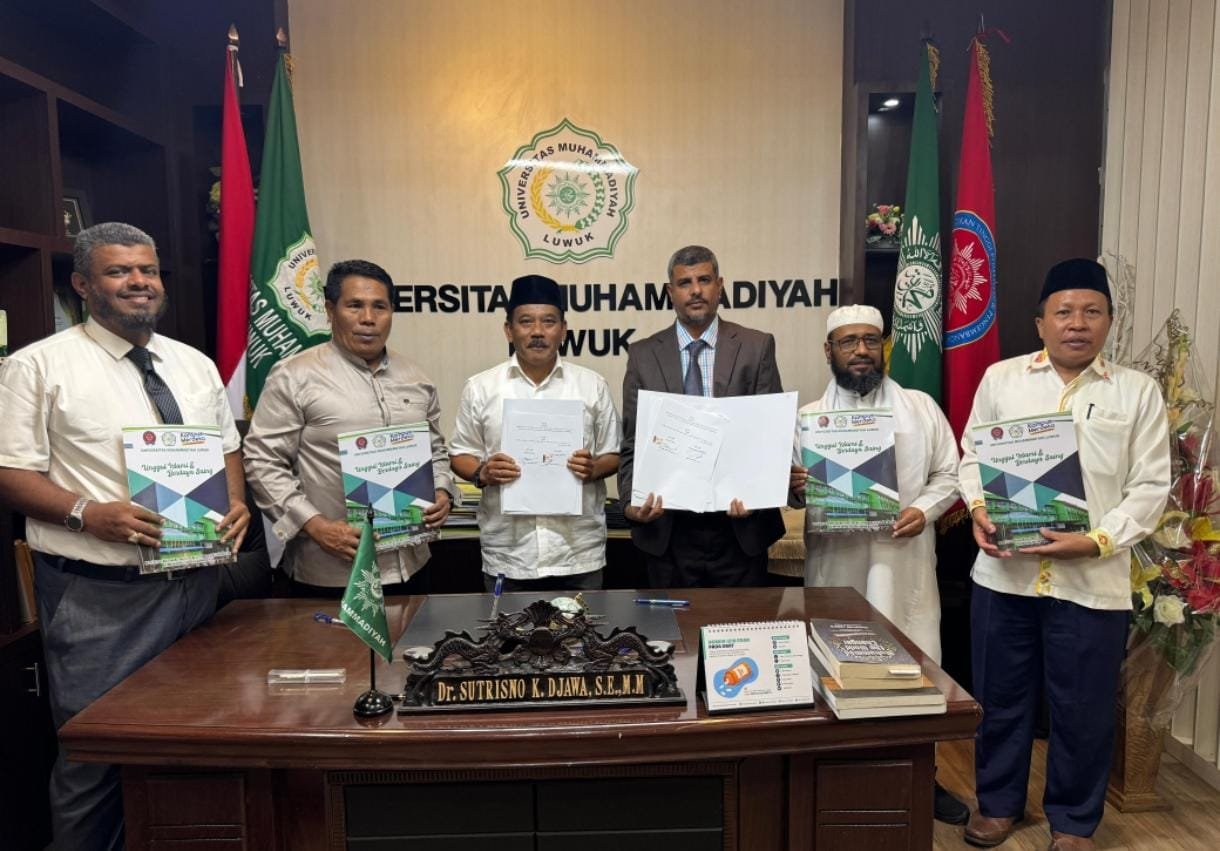 Dalam suasana pertemuan yang penuh semangat di ruang Rektor Unismuh Luwuk, Dr. Sutrisno K. Djawa menandatangani nota kesepahaman (MoU) bersama Wakil Rektor Universitas Hadramaut, Prof. Dr. Mokhtar Mohammed Mehdar.